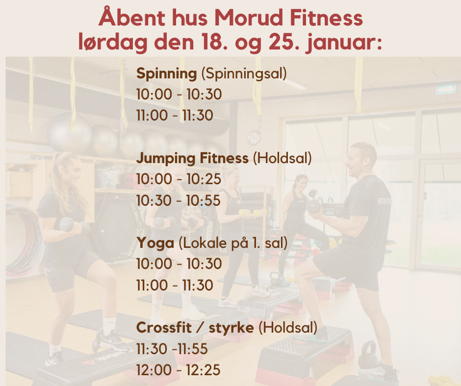 Prøv populære træningsformerFra kl. 10:00 til 13:00 kan besøgende deltage i prøvetimer med nogle af de mest populære holdtræningsformer. Uddannede instruktører fra Morud Fitness vil guide deltagerne gennem spinning, Jumping Fitness©, yoga og crossfit/styrke. Holdene er designet til begyndere, så alle kan være med, uanset forudgående erfaring.